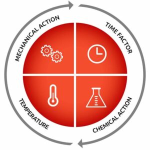 In the late 1950es, the German chemist Herbert Sinner defined the four key parameters of all cleaning processes: temperature, time, chemistry, and mechanics. The parameters are often depicted together in the so-called Sinner’s circle to show that they depend closely on one another. If you reduce one, one or more of the other three need to be increased.